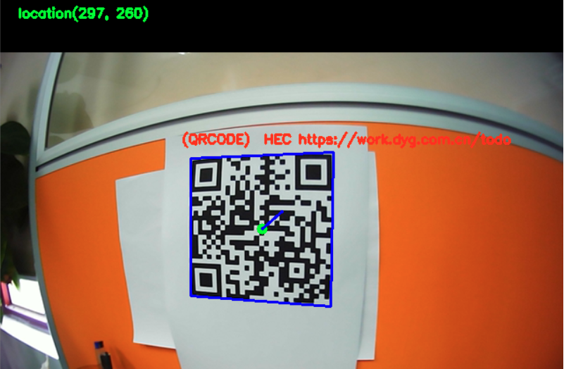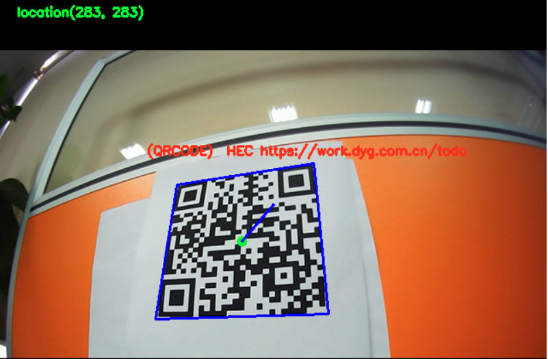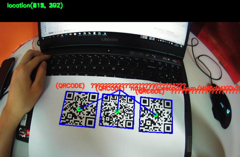 camera=cv2.VideoCapture(0) camera.set(3,1280) camera.set(4,768) while True: (grabbed,frame)=camera.read() h1,w1= frame.shape[0],frame.shape[1] dst = frame text = pyzbar.decode(dst) for texts in text: textdate = texts.data.decode('utf-8') print(textdate) (x, y, w, h) = texts.rect print('识别内容:'+textdate) cx = int(x + w / 2) cy = int(y + h / 2) cv2.circle(dst, (cx, cy), 2, (0, 255, 0), 8) print('中间点坐标:',cx,cy) coordinate=(cx,cy) cv2.putText(dst,'QRcode_location'+str(coordinate),(20,20), cv2.FONT_HERSHEY_SIMPLEX, 0.5, (0, 255, 0), 2) cv2.line(dst, (cx,cy),(int(w1/2),int(h1/2)), (255, 0, 0), 2) cv2.line(dst, texts.polygon[0], texts.polygon[1], (255, 0, 0), 2) cv2.line(dst, texts.polygon[1], texts.polygon[2], (255, 0, 0), 2) cv2.line(dst, texts.polygon[2], texts.polygon[3], (255, 0, 0), 2) cv2.line(dst, texts.polygon[3], texts.polygon[0], (255, 0, 0), 2) txt = '(' + texts.type + ') ' + textdate cv2.putText(dst, txt, (x - 10, y - 10), cv2.FONT_HERSHEY_SIMPLEX, 0.5, (0, 50, 255), 2) cv2.imshow('dst',dst) if cv2.waitKey(1) & 0xFF == ord('q'): cv2.imwrite("./frame.jpg", frame) break camera.release() cv2.destroyAllWindows()